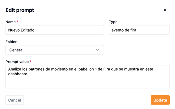 Para modificar un prompt existente pulsaremos el icono de edición (), lo que abrirá el formulario con los campos rellenados. Tras realizar los cambios pulsaremos el botón "Actualizar" para guardar las modificaciones.