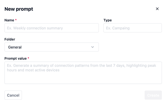 Cada prompt debe contar con un nombre identificativo, estar asignado a una carpeta organizativa, e incluir un valor, que será el contenido del prompt en sí (una cadena de texto que define la instrucción para la IA). De forma opcional, también podemos asignarle un tipo, útil para clasificar o filtrar los prompts según su finalidad.