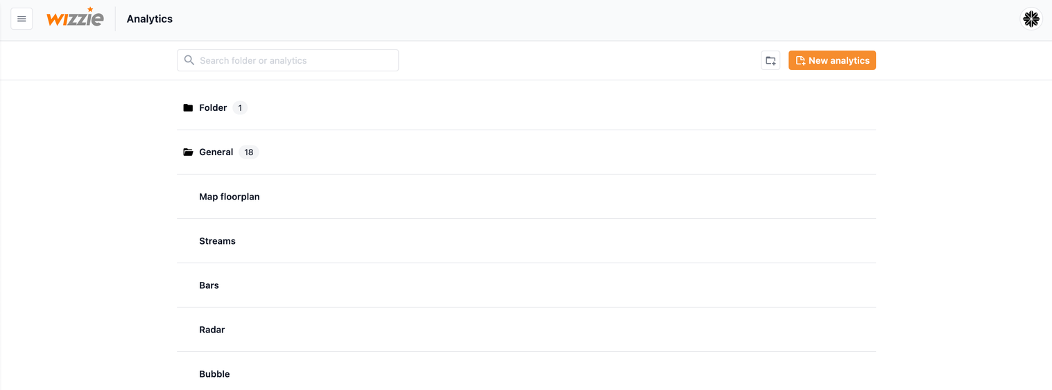 Para realizar una consulta, acceda a la sección "Analíticas" desde el menú lateral. Se abrirá la vista de gestión de analíticas, donde podrá crear nuevas consultas, organizarlas en carpetas, editarlas, moverlas o eliminarlas.